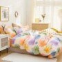 W komplecie mogą znajdować się poszwy na kołdry, prześcieradła i poszewki na poduszki, ozdobione w jednolitym stylu wzorem kolorowych liści.