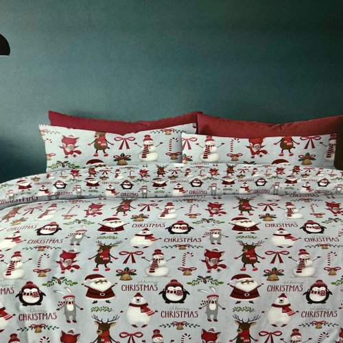 Zestaw Wesołych Świąt może mieć różne rozmiary (półtora, podwójne, euro, rodzinne) i zawiera prześcieradło, poszwę na kołdrę i poszewki na poduszki.